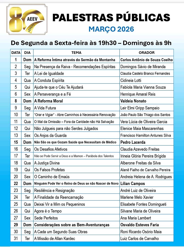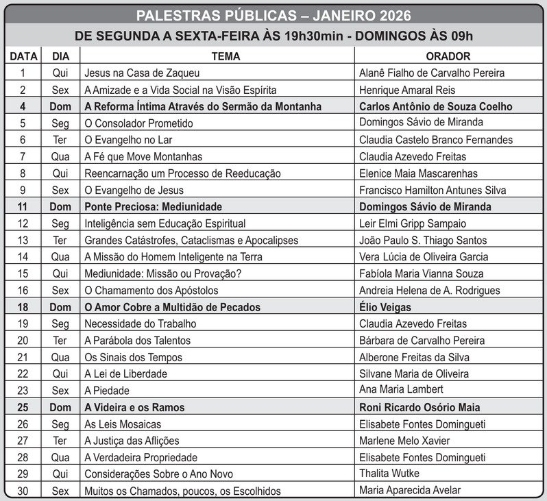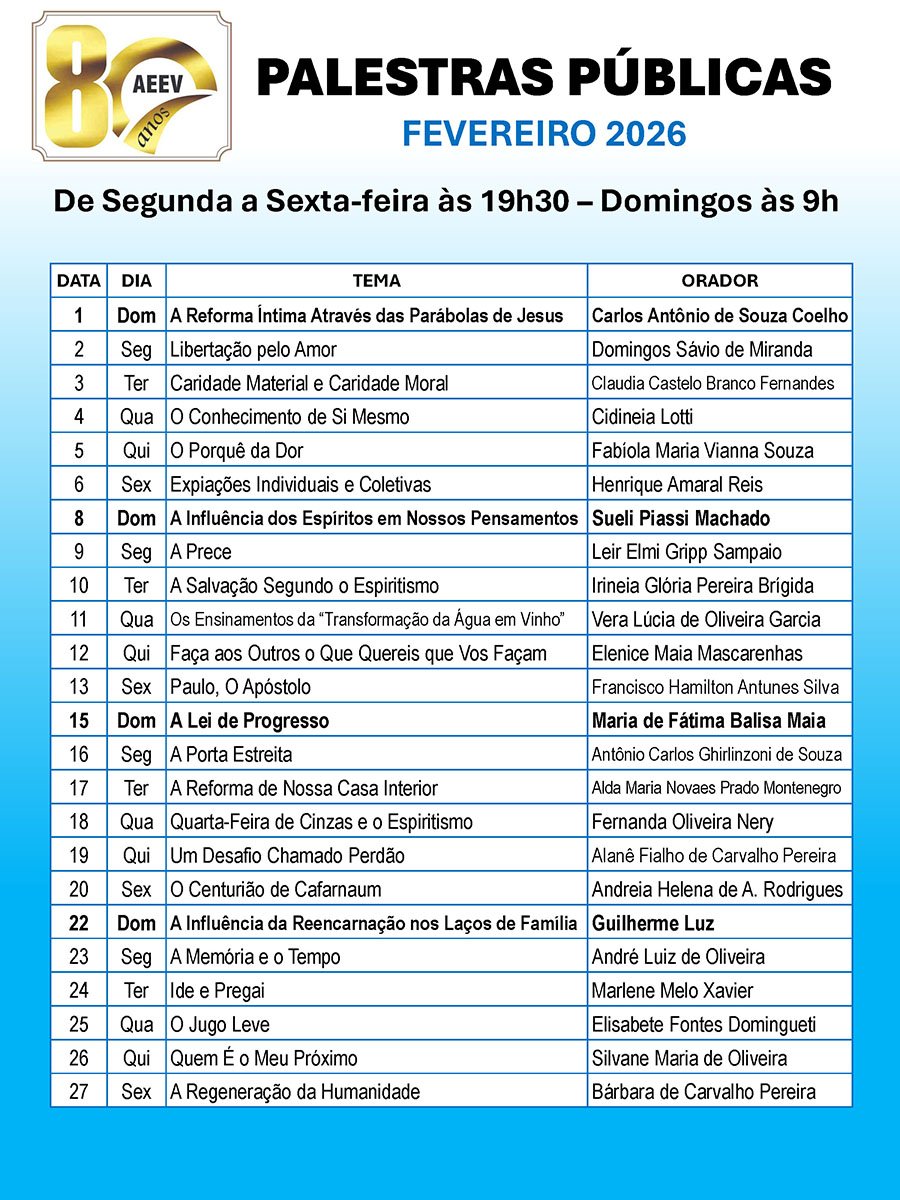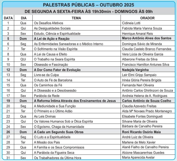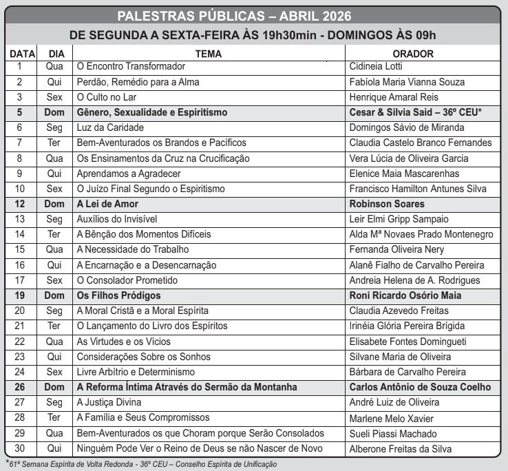 Aos domingos, das 9h às 10h30 – no mesmo horário da palestra pública.